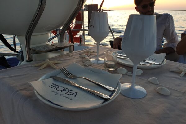 Entdecken Sie mit Ihrem/Ihrer Liebsten einen Teil der wildromantischen Steilküste mit langen Sandstränden, versteckten Buchten, Klippen und Grotten. Schwimmen Sie (optional) im klaren Meerwasser bei der „Grotta Bianca“ bevor Sie bei einem Prosecco den Sonnenuntergang geniessen. Lassen Sie sich dann voll und ganz von unserem Skipper verwöhnen und genießen Sie ein romantisches Abendessen auf unserer Segelyacht bei Kerzenschein in wunderschöner Kulisse während wir unterhalb der Inselkirche Santa Maria dell’Isola ankern, mit Blick auf die majestätische Altstadt von Tropea.