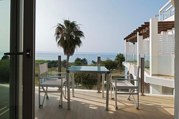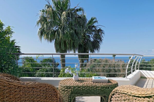 Großes Zimmer mit einer 50 m² großen Panoramaterrasse mit atemberaubendem Meerblick, modern und elegant, leise, sehr hell, mit einer Dusche mit Chromotherpie ausgestattet sowie einem King Size Bett, Bademänteln, Kaffeemaschine, Wasserkocher, Waage, Jacuzzi-Whirlpool auf der Terrasse.