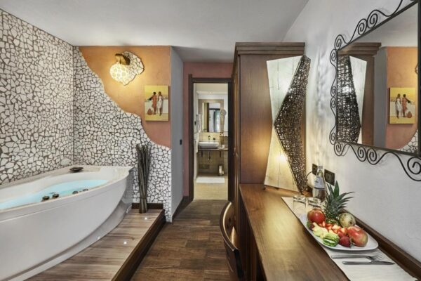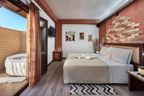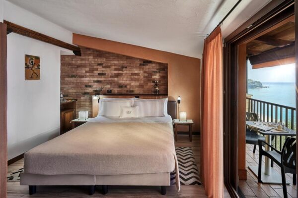 L’Hotel Rocca della Sena ha 3 camere Deluxe Vista Mare, tutte al I° piano. Queste magnifiche Suites sono il fiore all’occhiello del nostro Boutique Hotel. Questa camera è più spaziosa di quelle Superior, circa 21 mq. La camera Deluxe Vista Mare è un autentico sogno: il suo punto di forza è la terrazza con vista mare, dove ti aspettano due comodi lettini prendisole, una vasca idromassaggio esterna e un piccolo tavolino con 2 sedie. Chiudi gli occhi e comincia ad immaginare: la brezza marina, il blu, l’idromassaggio. Le camere Deluxe Vista Mare sono arredata in stile etnico, semplici e curate, con pavimento in parquet.