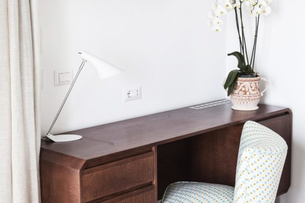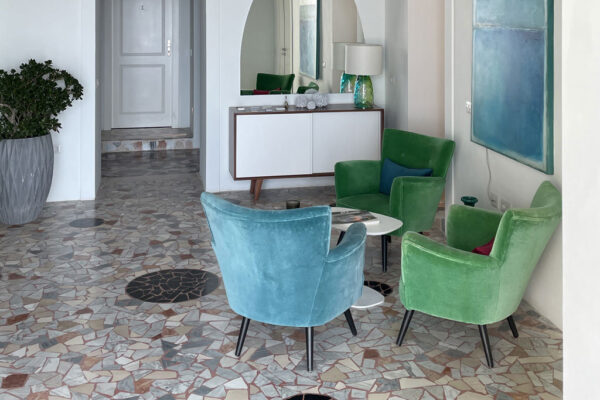 Divani in midollino, ombrelloni telati e tavolini alabastrini accolgono le pause dedicate al relax, la lettura di un libro, le chiacchiere tra ospiti. Uno spazio comune dove poter riposare e rinfrescarsi, o, semplicemente, fantasticare su quella che fu La Dolce Vita di un tempo.