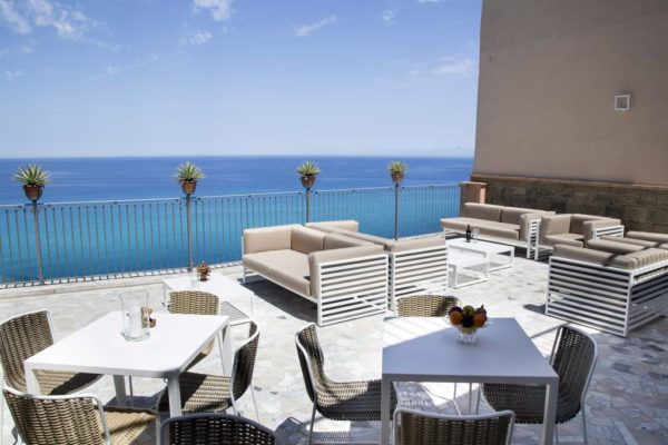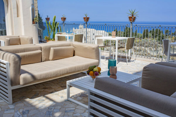 La terrazza, cuore pulsante di Palazzo Barone, stacca su di una rupe a strapiombo sul mare e immerge l’ospite in uno scenario dalla bellezza perdifiato.