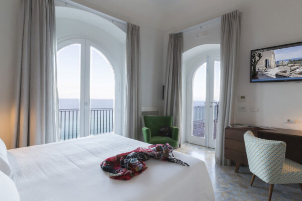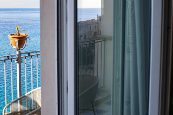 Da qui si scorge l’isolotto del Santuario della Madonna dell’Isola e in lontananza anche le isole Eolie, restituendo un panorama mozzafiato, per un soggiorno indimenticabile. Spaziosa e luminosa, la Camera Deluxe è la sistemazione più esclusiva, l’unica a disporre di un balcone privato con vista sul mare.Alla camera Deluxe si accede da una porta finestra che dà direttamene sulla terrazza panoramica comune, set di memorabili aperitivi al tramonto. Dispone di bagno con doccia walk-in e specchio retroilluminato.