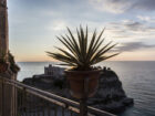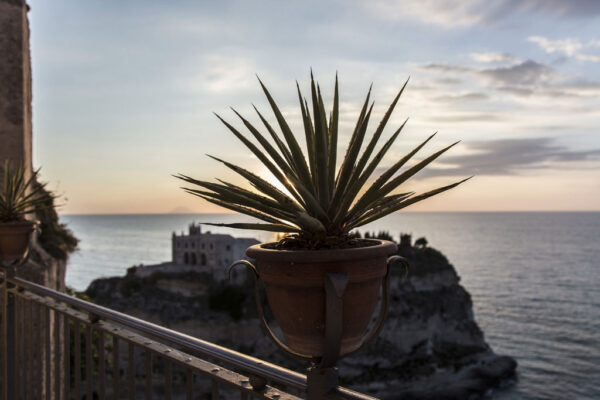 Il sole tinge il cielo di calde sfumature rosa, gialle e arancio che si riflettono sul mare dietro il Santuario della Madonna dell’Isola. In lontananza, dove il cielo e il mare si fondono, si scorgono anche le isole Eolie, disegnando un panorama mozzafiato.