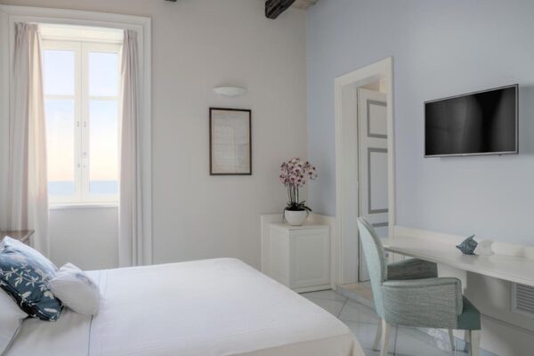 CAMERA MATRIMONIALE SUPERIOR CON VISTA MARE A strapiombo sul mare, sopra di Voi solo il cielo, la camera matrimoniale Superior con vista mare (25 mq circa), intima e luminosa, Vi accoglie in un ambiente soffuso ed elegante, nel quale elementi di epoca e confort moderno, si coniugano in perfetto equilibrio per regalare sensazioni ed emozioni uniche.