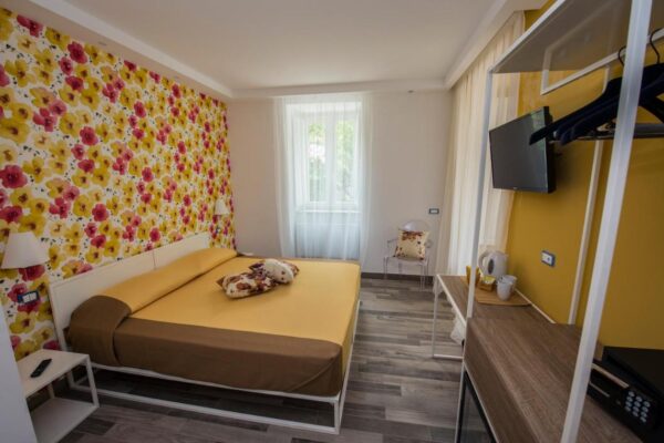 Climatizzatore, insonorizzatore, letto matrimoniale con letto Dorelan, Tv, cassaforte , minibar, telefono, Wifi, chiamata d'emergenza bagno, bollitore con infusi assortiti.