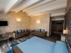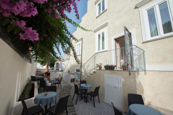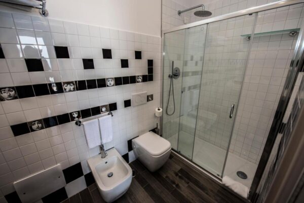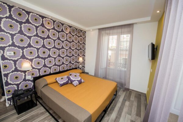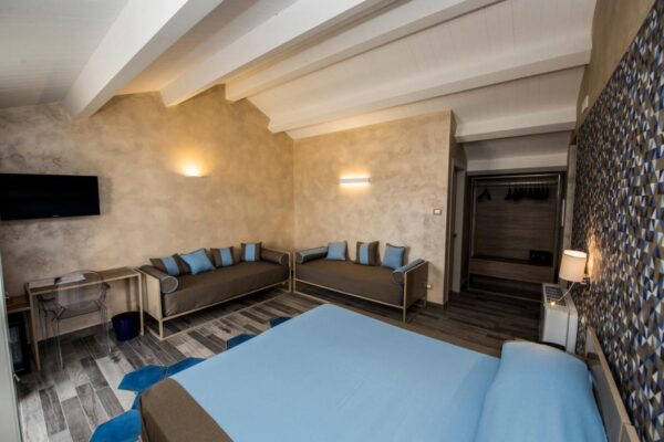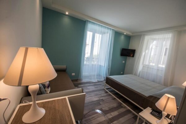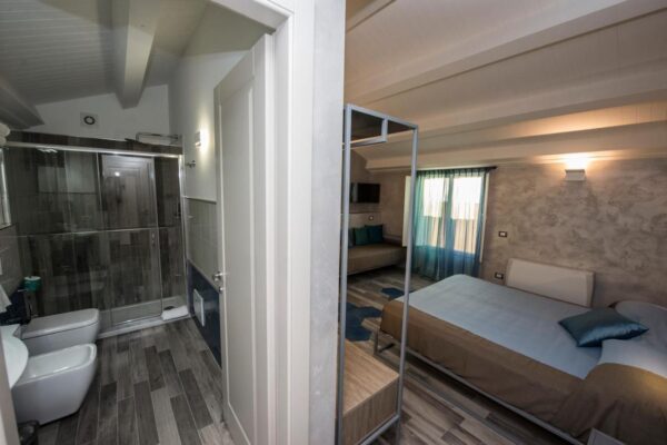 La camera matrimoniale deluxe di 23 mq ubicata al primo piano della villa si affaccia sulla pittoresca e centrale via Libertà e grazie alla presenza di un balconcino, si può godere anche di una bella vista sul mare. Arredata in stile moderno, si caratterizza per l’armonia dei colori, che conferiscono all’ambiente un’atmosfera gradevole e accogliente. Bagno comodo e funzionale completo di bidet con ampia doccia, phon, chiamata d’emergenza e set di cortesia.
