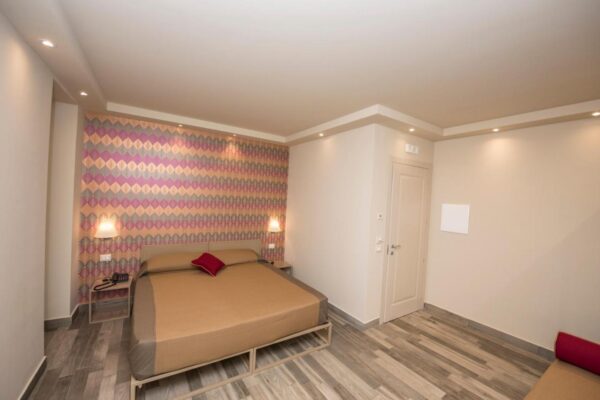 Climatizzatore, insonorizzatore, letto matrimoniale con materasso Dorelan, letto singolo con materasso Dorelan, TV, cassaforte, minibar, Wifi, bollitore con infusi assortiti.