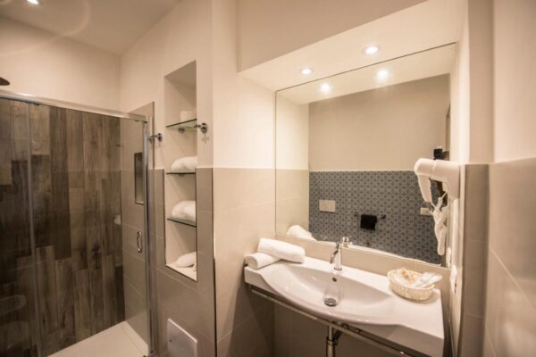 Climatizzatore, Insonorizzatore, letto matrimoniale con materasso Dorelan, TV a schermo piatto, 32 pollici con canali satellitari nazionali ed internazionali, cassaforte, minibar, telefono, wifi , set di cortesia, phon, doccia , chiamata d'emergenza bagno, bollitore con infusi assortiti, terrazzo attrezzato.