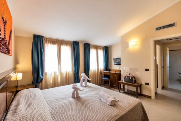 Sono tutte climatizzate, con bagno privato, doccia, asciugacapelli, telefono, Tv Sat, cassaforte e minibar e connessione Wi-Fi. Le 115 camere sono suddivise in Standard, Comfort e Vista, Junior Suite e Suite possono accogliere il turista di passaggio, l'uomo d'affari o la famiglia in vacanza.