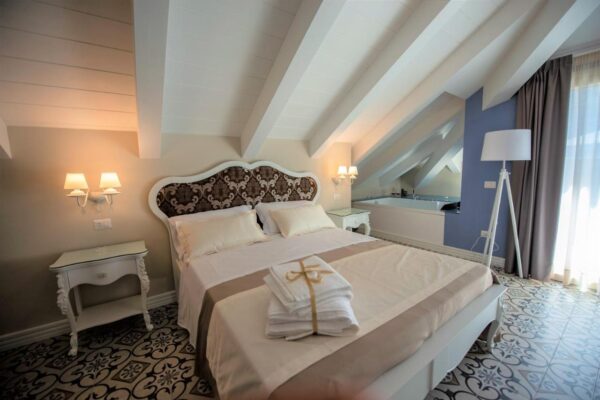 Junior Suite: collocata all’ultimo piano del Resort, la Suite combina l’eleganza e il comfort con una posizione privilegiata. Dal terrazzino privato potrete infatti ammirare l’antico centro storico con uno scorcio del porticciolo turistico e del mare o il verde rigoglioso dell’entroterra.