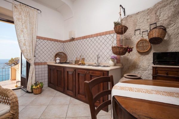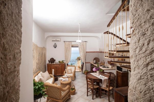 L’appartamento, in parte scavato nella roccia, si trova in questo caratteristico contesto e si articola su 2 livelli: in basso il salotto con angolo cottura e terrazza di circa 40 m² da cui godere della splendida vista dello specchio d’acqua, del tramonto e delle isole Eolie in lontananza; al primo piano 1 camera da letto matrimoniale con balconcino vista mare, 1 cameretta, bagno e 2 ingressi direttamente sulla piazzetta di cui uno ha un piccolo terrazzino assolato.