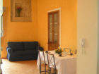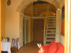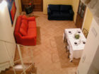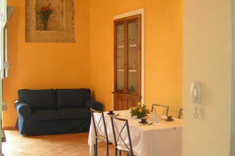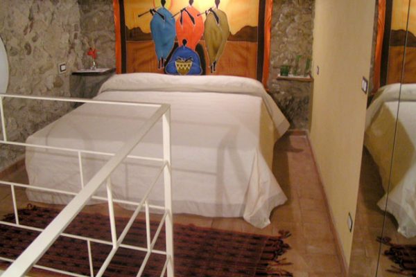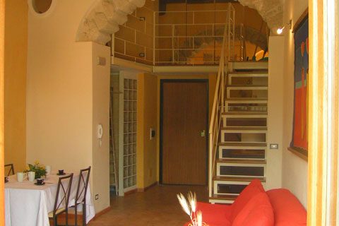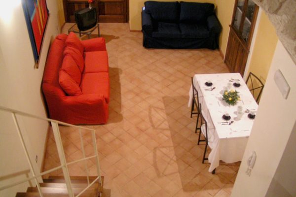 Più avanti si trova il soggiorno composto da un tavolo con sedie, un divano letto e un balcone con un terrazzino vista mare. Dal soggiorno tramite una scala si accede al piano superiore dove si trova una camera doppia in ambiente aperto.